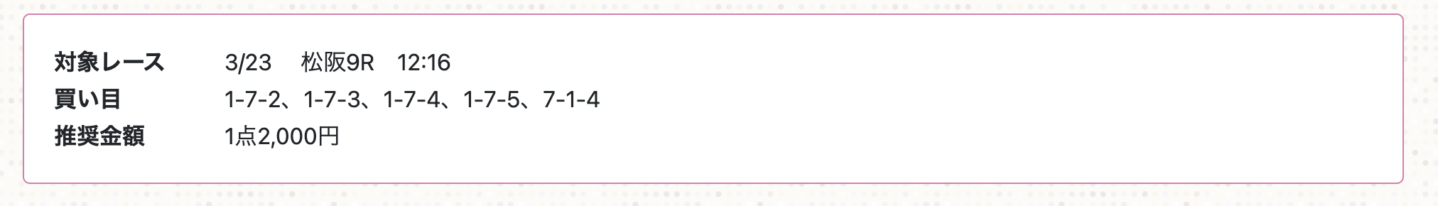 4サイトが予想した松阪会場。まずはチャリ活の9R、3番人気の7-1-4となりました。10.5倍ですが、1点2000円なので21,000円の払戻金でGood。