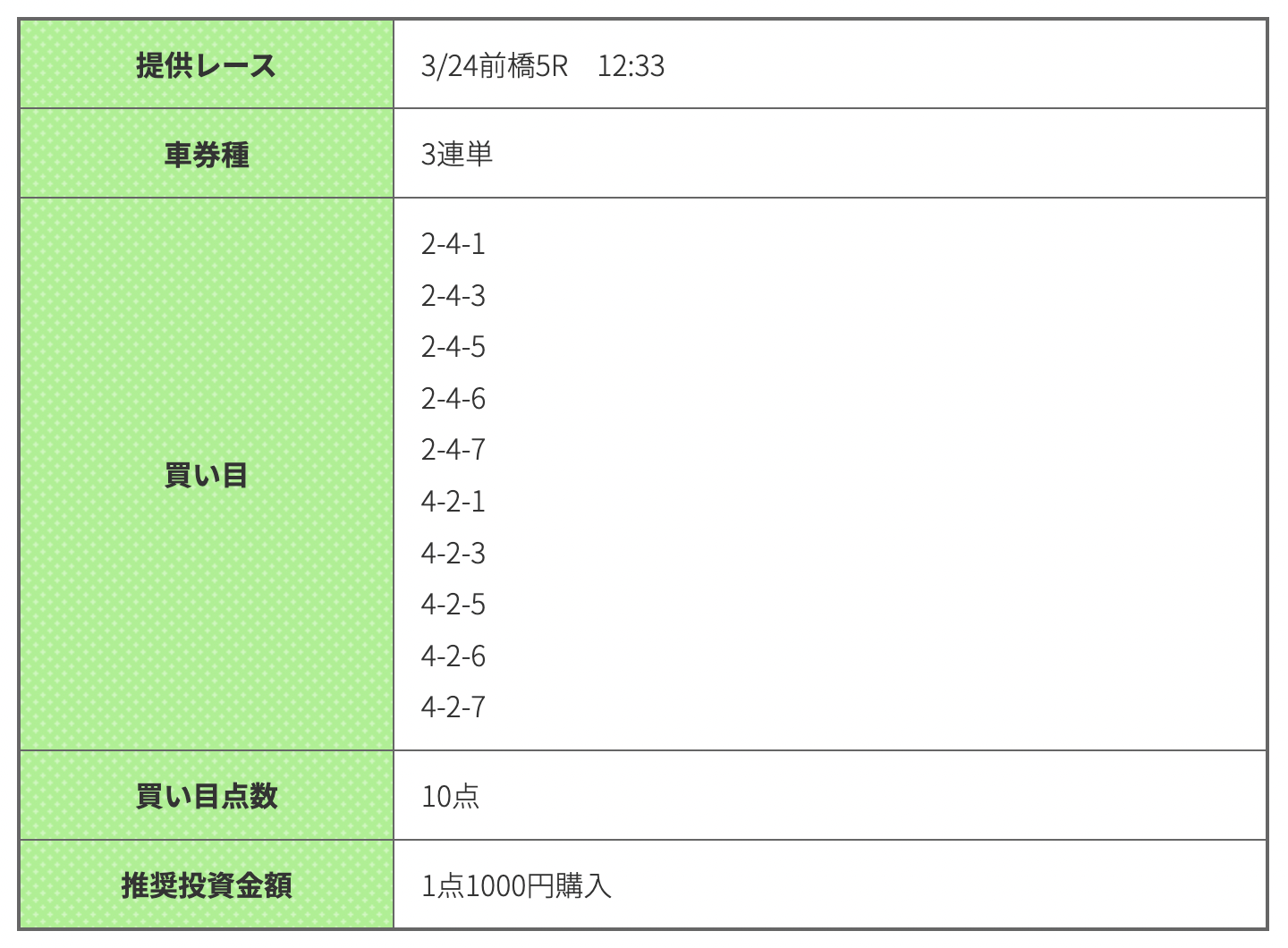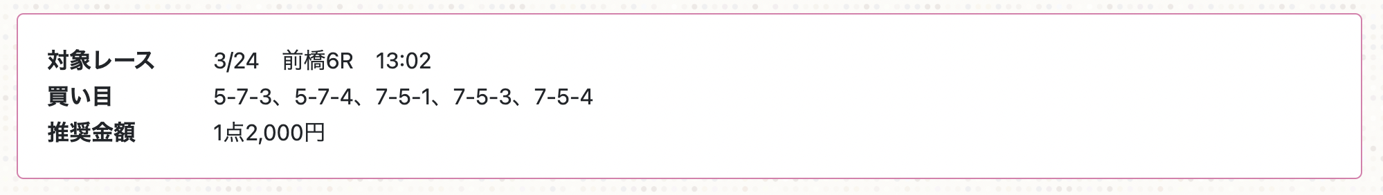 静岡7Rは虎の穴が予想。結果は16番人気の2-4-7(89.5倍)で不的中。2-7が絡むことは予想できていたものの、4番が2着に食い込んだことで、3着予想の3番5番が車券に絡まず残念…。