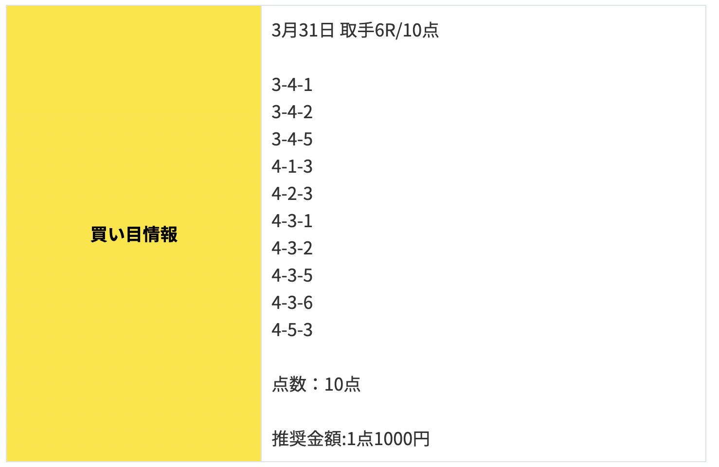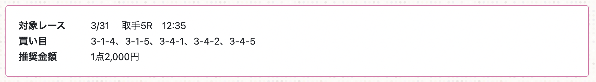 3/31はほとんどのサイトが取手に集中したため、松阪会場は虎の穴のみ。松阪1Rは1番人気の1-2-5(6.8倍)で決着、不的中でした。