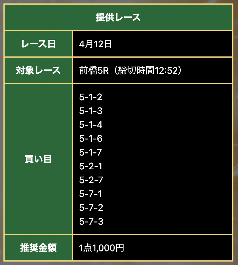 続く前橋5Rは競輪ライジン(上)とチャリ活(下)の2サイトが予想。結果は5-1-2で両サイトとも的中。ライジンは9,500円でトリガミ、チャリ活は19,000円の払戻となりました。