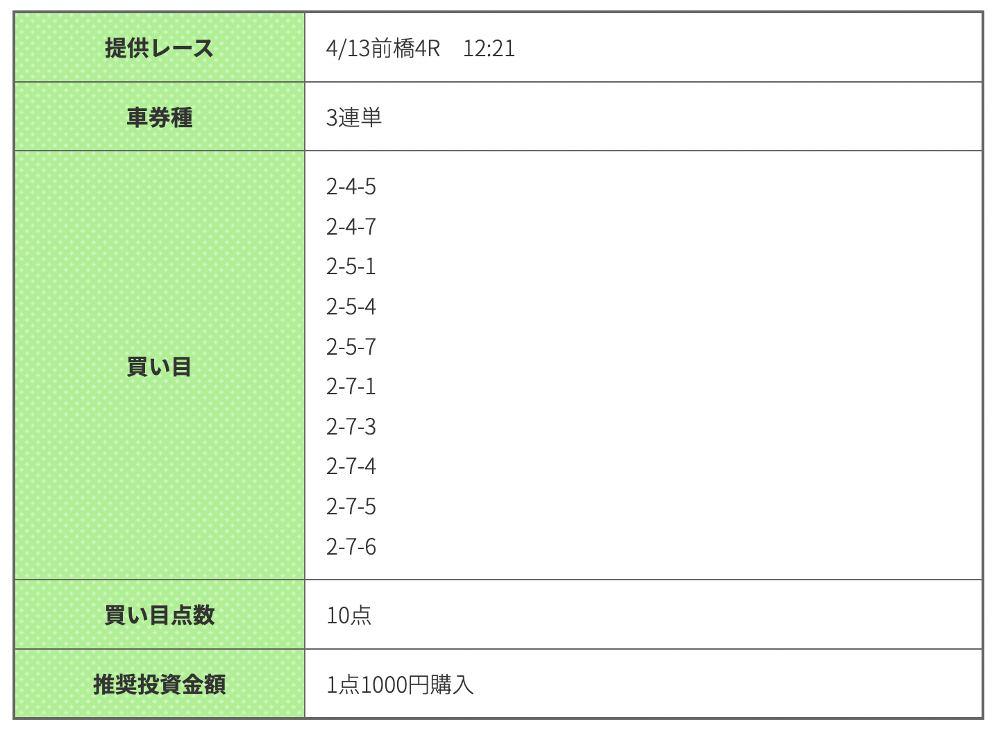前橋4Rは競輪ギアの予想。結果は1番人気の2-7-4(7.0倍)、7,000円の払戻でトリガミとなりました。