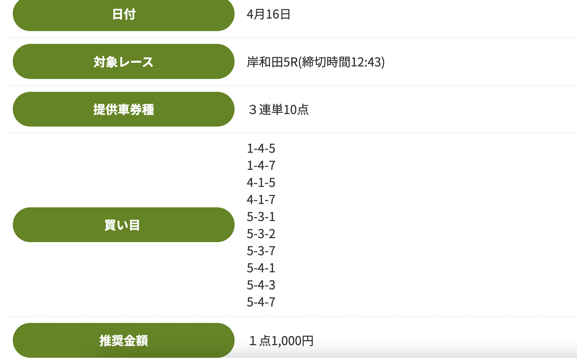 岸和田5Rは競輪アンビシャス(上)と競輪ライジンの2サイトが予想。結果は3番人気の5-3-2(15.8倍)、15,800円の払戻となりました。